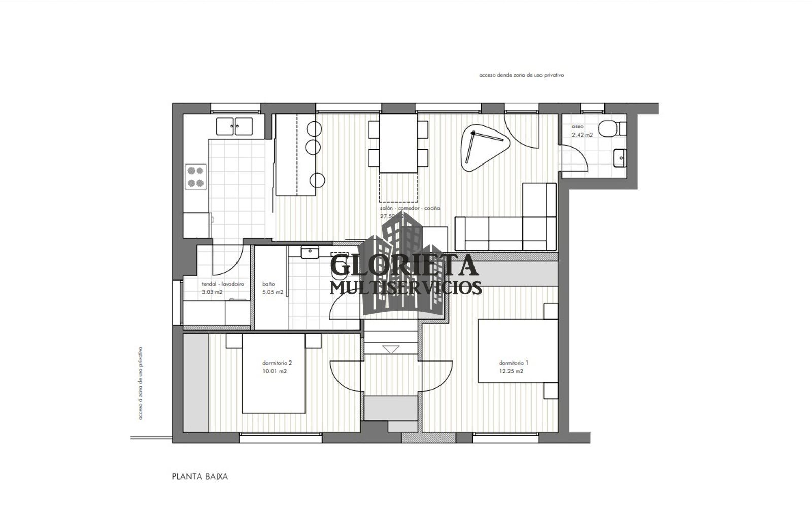 En el proyecto se distribuye en dos dormitorios, uno de 12,25m2, y otro de 10,01m2. Un cuarto de baño completo de 5,05m2 y plato de ducha. Un aseo de 2,42m2. Cocina americana abierta a un salón comedor de 27,50m2. Y por último un lavadero de 3.03m2.